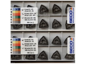 | M | CP500 | CP500 韧性好的超细颗粒材质等级针对不锈钢进行精加工和半精加工,但是适用性宽泛,还可用于钢件和钛合金。特别适用于断续切削加工。 | CVD涂层 |
